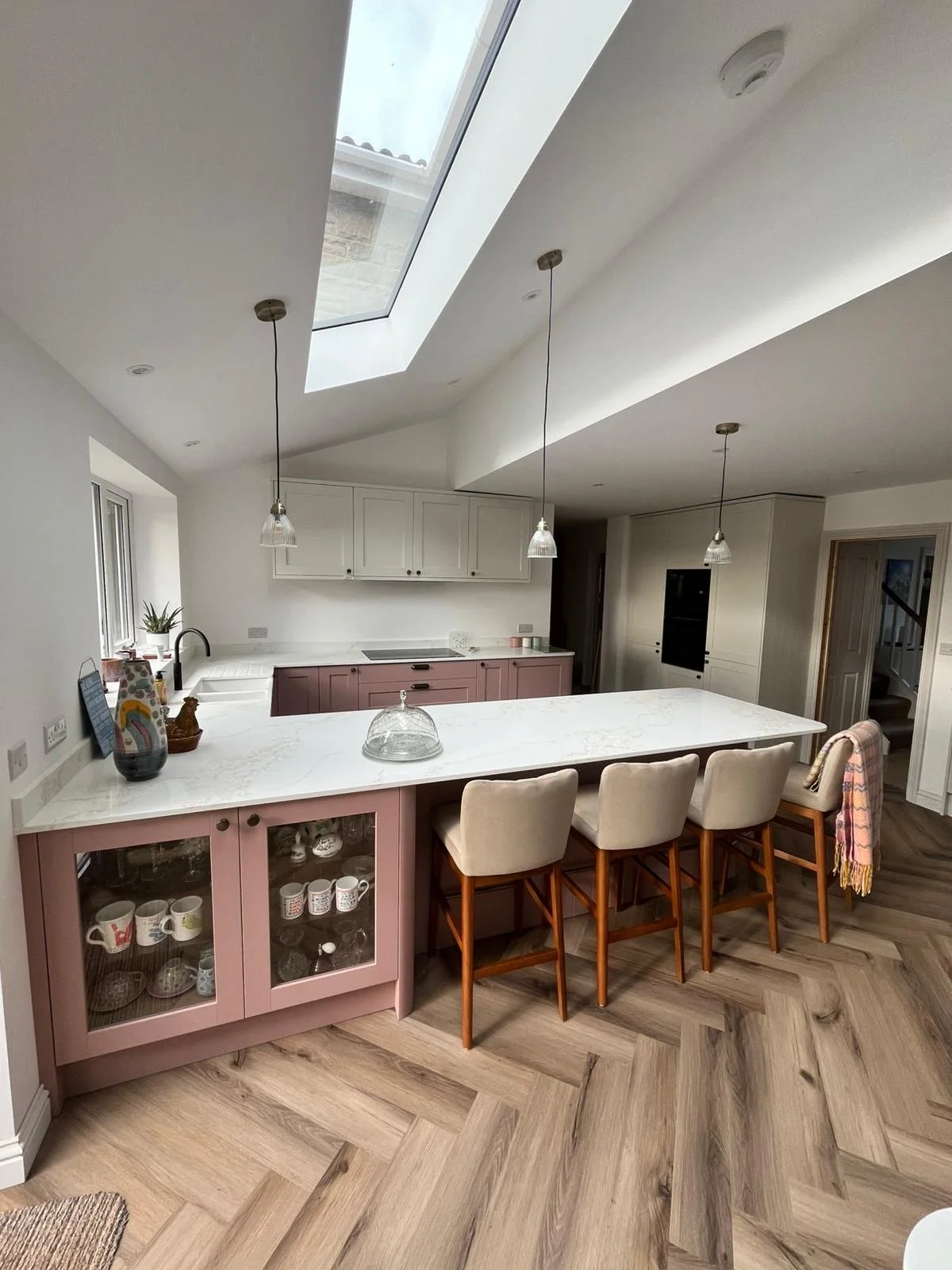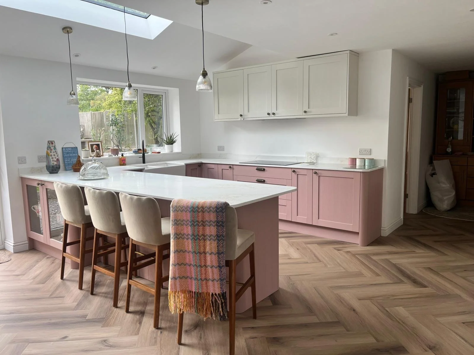 This stunning antique rose matched with porcelain shaker kitchen was supplied by Howdens who were very much able to accommodate the clients vision with cabinetry and design.